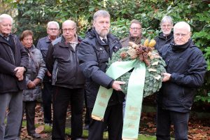 Gedenkfeier für die Opfer des Grubenunglücks. Gedenkveranstaltung am Totensonntag, 22. November, auf dem Westfriedhof in Unna. Die Ansprache hielt Pfarrer i.R. Hartmut Hegeler. Die Mitglieder des Knappenvereins Unna- Königsborn beteiligten sich in traditioneller Bergmannstracht. (Fotos Hegeler)