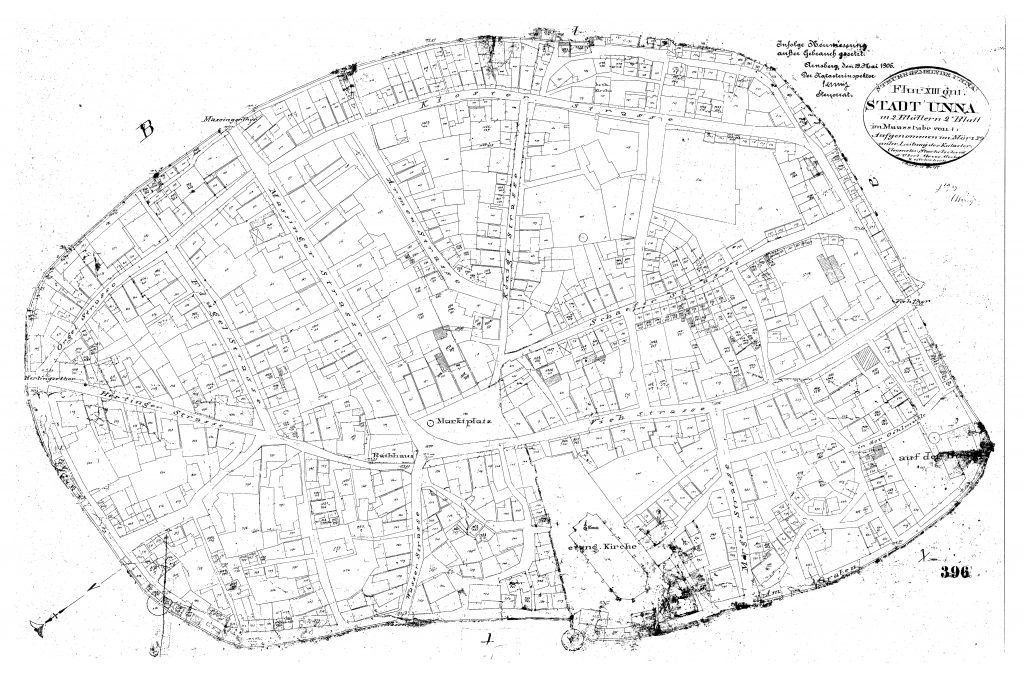 Aufgenommen im März (18)29 unter Leitung des Kataster-Geometer Stachelscheid, außer Gebrauch gesetzt am 19. Mai 1906.