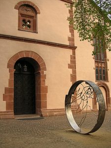 Gelnhausen (epd). Vor dem Westportal der Marienkirche in Gelnhausen ist am Reformationssonntag eine Skulptur für Elisabeth Strupp enthüllt worden, die vor 400 Jahren als Hexe enthauptet und verbrannt wurde. Für die Pfarrersfrau, die nicht einmal ein Grab in Gelnhausen hat, wurde somit ein Mahn- und Denkmal aus Edelstahl von der in Berlin lebenden Künstlerin Fanna Kolarova errichtet. Das Denkmal zeigt eine Frauengestalt, die tanzend – vielleicht fliehend – in einem schweren Stahlring gehalten wird. „Das Denkmal stellt Elisabeth Strupps Kraft dar,“ meinte Dekan Martin Happel bei der Enthüllung. Elisabeth Strupp gehörte als Witwe des Pfarrers Johann Strupp zu der großen Reformatorenfamilie Gelnhausens. (11.11.99)