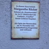 Text: In diesem Haus betrieb Margarethe Rücker bekannt als „Karpfenwirtin“ im 16./17. Jahrhundert das Gasthaus „Carpffen“ (heute „Goldener Karpfen“). Als Opfer des Hexenwahns am 19. Dezember 1611 in Aschaffenburg hingerichtet und verbrannt.