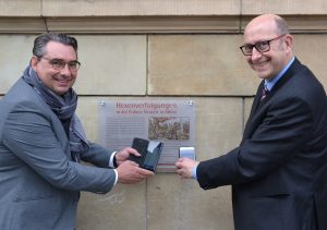 Das Faltspiel »Himmel und Hölle« hat der Aschaffenburger Bildhauer Marc Rammelmüller in eine Stahl-Plastik zum Gedenken an die Opfer der Hexenverfolgung umgedeutet. Oberbürgermeister Klaus Herzog hat am 24.11.2018 das Mahnmal auf dem Grünstreifen in der Weißenburger Straße übergeben.
