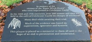 In memory oft the victims of the „Essex Witch Hunts“ who were imprisoned in Colchester Castle. In the 16th and 17th centuries, over 200 women and men were held in the cells of the Colchester Castle on charges of witchcraft. Many died while awaiting their trial. Much of the evidence was based on superstition, ignorance and hysteria. This plaque is placed as a memorial to them all and in the hope of an end to persecution and intolerance.