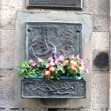 Witches´ Well (Hexenbrunnen) of 1894 situated at the entrance to the Edinburgh Castle Esplanade on the west wall of The Tartan Weaving Mill. A cast iron wall fountain commemorates the place where over three hundred women were burned at the stake accused of being witches.