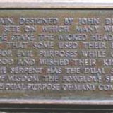 Is near the site on which many witches were burned at the stake. The wicked head and serene head signify that some used their exceptional knowledge for evil purposes while others were misunderstood and wished their kind nothing but good. The serpent has the dual significance of evil and wisdom. The Foxglove spray further emphasises the dual purpose of many common objects.“