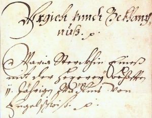 Titelseite der Akte Anna Maria Sterck: „Urgicht unndt Bekhanthnuß Maria Sterckhin eines mit der Hexerey behaften 11 jährigen Mädlins von Engelschwiß“, 1679 (Wikipedia)
