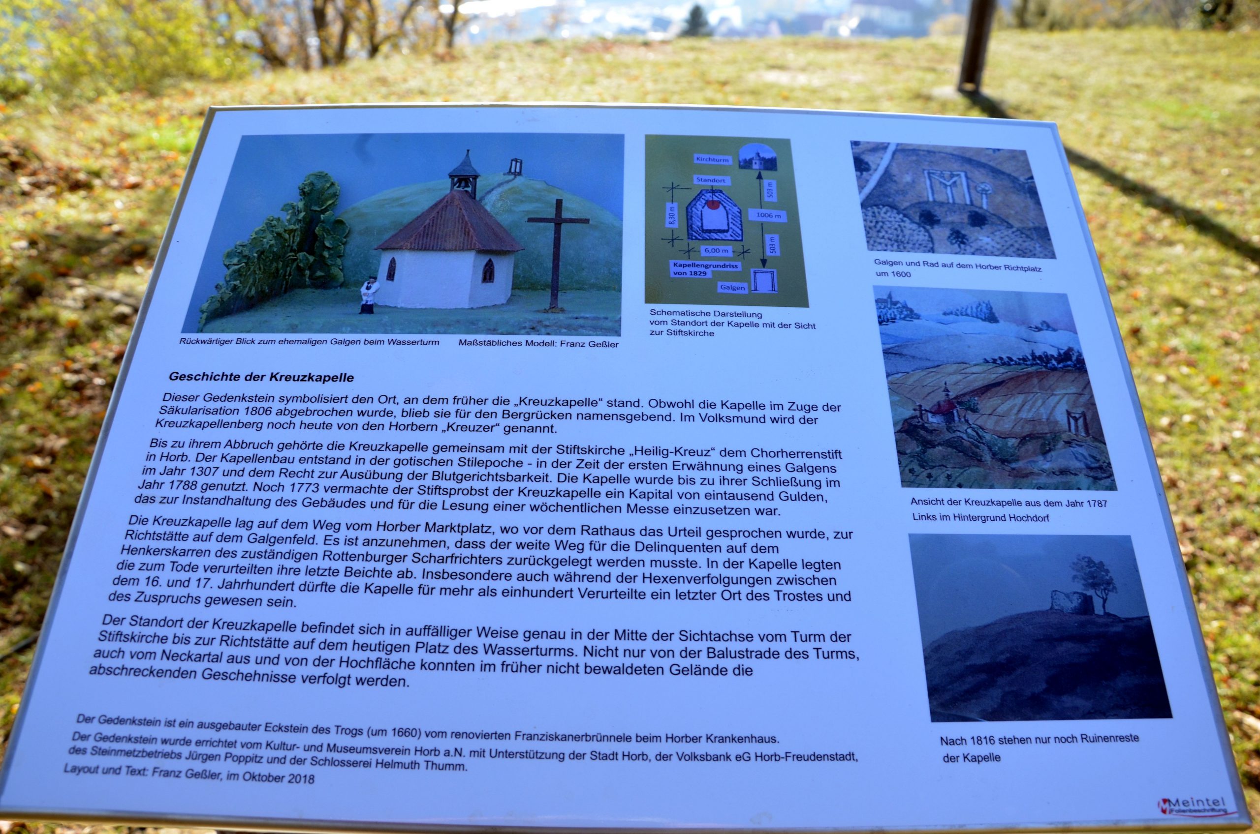Der Gedenkstein auf dem Kreuzkapellenberg, der vom Kultur- und Museumsverein in Absprache mit dem Landesdenkmalamt initiiert wurde, erinnert an die abgegangene Kreuzkapelle, die für Delinquenten die letzte Station auf dem Weg zur Horber Richtstätte bildete. Diese befand sich an Stelle des im Jahr 1936 erbauten Wasserturms, der auf dem höchsten Punkt des Kreuzkapellenbergs die neue Horber Wehrmachtskaserne mit Wasser versorgt hat.