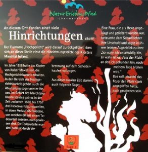 Auf rund 3,5 km vermittelt der Natur-Erlebnis-Pfad Obermarchtal vieles über Geschichte und Sagen. Hochgericht bei Obermarchtal: Aburteilung sogenannter Hexen. Drei Hexenverfolgungswellen nachgewiesen mit 65 Prozessen, 60 mit Todesurteilen.