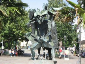 Bürgerbrunnen vom Bildhauer Hans Gerd Ruwe auf dem Platz des Westfälischen Friedens, der in Bronze gegossen die Geschichte der Stadt erzählt.