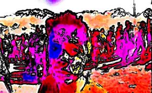 An drei Pfählen hängen drei Frauen. Über den Köpfen der Frauen ist jeweils ein Schild mit dem Namen und dem Todesdatum befestigt:
