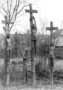 „Frauen an Schandpfählen“ (Bildhauer: Bernhard Kleinhans, 1998; Sign. BERNHARD 1996 [450 / 290 / 90 cm]. Foto: Andrea Brockmann). An Hexenprozesse in Langenstraße erinnert die Skulpturengruppe „Frauen an Schandpfählen“. 2001 vor dem Museum Abtei Liesborn, Ausstellung: „Hexenverfolgung im Kreis Warendorf im 16. und 17. Jahrhundert“, jetzt im Garten von Maria Kleinhans in Sendenhorst. Die Kreuzigungsgruppe schuf der Sendenhorster Bildhauer Bernhard Kleinhans.