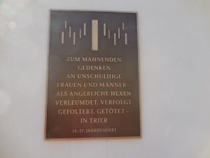 Gedenktafel in Trier für Opfer der Hexenprozesse vor der Porta Nigra an der Fassade des Stadtmuseums Simeonstift. 2015 Inschrift der Gedenktafel: „Zum mahnenden Gedenken an unschuldige Frauen und Männer – als angebliche Hexen verleumdet, verfolgt, gefoltert, getötet – in Trier. 15. – 17.Jahrhundert.“