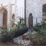 Haus an der Agnes-Bernauer-Straße – Bronzefigur der Agnes Bernauer neben dem Burgtor. 1995 Skulptur der Künstlerin Antje Tsche-Mentzen