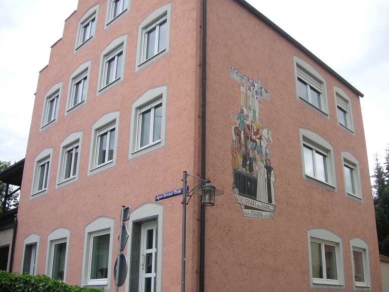 Gemälde am Haus an der Agnes-Bernauer-Straße, Denkmal an der Agnes–Bernauer–Brücke über die Donau entstand beim Neubau der Brücke 1954/55