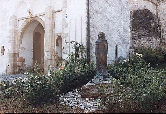 Haus an der Agnes-Bernauer-Straße – Bronzefigur der Agnes Bernauer neben dem Burgtor. 1995 Skulptur der Künstlerin Antje Tsche-Mentzen