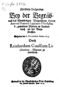 Das einzig erhaltene Exemplar der Leichpredigt von Pfarrer Reinhard Wolf für Pfarrer Anton Praetorius findet sich heute in der Bayrischen Staatsbibliothek München.
